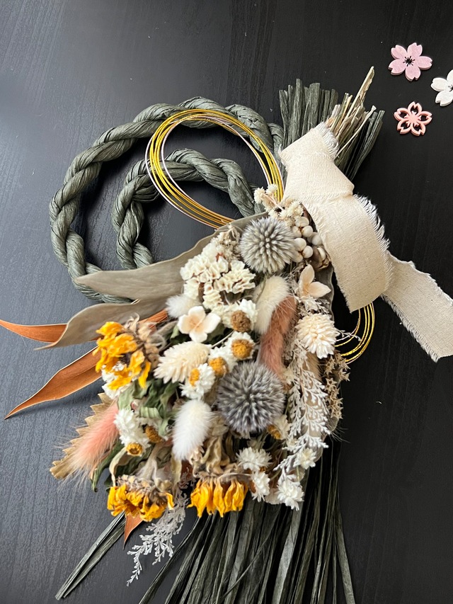 しめ縄部分とお花を取り外すことができる 2wayしめ縄飾りです。 お正月はしめ縄飾りとしてお使いいただき、 お正月後は、しめ縄部分と花束を取り外して 花束を長く楽しんでいただけるデザインにしています。 花束を壁にかけたり、花瓶にさすなど インテリアが華やぐとともに お花を見るだけでふわっと心が軽くなり癒されます。 花材はすべて天然素材の ドライフラワーを使用しています。 しめ縄リースの「リース」に込められた意味は、 輪っかの形に切れ目がないことから 「永遠を象徴するもの」 とされ、 永遠に変わらない 深い愛という意味を持つと言われています。 花束の長さ 38cmほど しめ縄リースの直径 15cmほど 贈り物には、メッセージカードをお付けすることができます。 ご注文画面の備考欄に ご希望のメッセージ内容をお知らせください。 ※お花たちの種類や配置が 多少の変更となる場合がございます。 ※プリザーブドフラワーやドライフラワーはとても繊細です。 自然の植物を乾燥させているため、花びらや実が散りやすいもの壊れやすいものがあります。 強い力を加えたり、落下することがあると破損することがあるため お気を付けください。 ※配送の際に、花びらや木の実などが落ちる場合があります。 予めご了承くださいますようお願い致します。 ※プリザーブドフラワーやドライフラワーは、空気中の水分により色褪せていきます。 次第にアンティークな味わいが出てきます。 褪色も魅力のひとつとしてお楽しみく ださい。 日光が当たる場所や多湿の場所では褪色しやすくなるため 避けてください。 ※ホコリがついた時は、ドライヤーの送風でやさしく吹き飛ばしてください。 油汚れがつくとホコリが取れなくなってしまいますのでご注意ください。 ※ドライフルーツ、ドライハーブなど もございますが、 当店は全て観賞用であり食用ではありません。 ※実物そのもののお色が伝わるよう写真を掲載していますが、 機器によっては実物と色味が異なる場合がございます。 ※大切な方へのお届けについて、ご希望の日にちや時間指定がある場合は、事前にご相談ください。